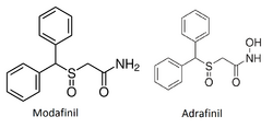 Adrafinil is very structurally similar to its close chemical cousin and bioactive metabolite, modafinil. The only structural difference is that terminal amide hydroxyl group of adrafinil ((diphenylmethyl)sulfinyl-2 acetohydroxamic acid) is lacking in modafinil (diphenylmethyl)sulfinyl-2 acetamide).[1]
