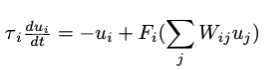 which represents the activities of many coupled neurons. W_ij represents the strength of connections between neurons so that Eq. (5) is a generalization of Eq. (4).This network can be separated into as many layers as desired; we include no intrinsic organization. Suppose that we subtract off the background activity of the network so that u_i(t) represents the deviation from background and F_i(0) = 0. For simplicity, we set τ_i = 1. We can ask whether or not this background state is stable.To determine this, we need to linearize about the rest state, u = 0. The stability is determined by the eigenvalues of the matrix:
